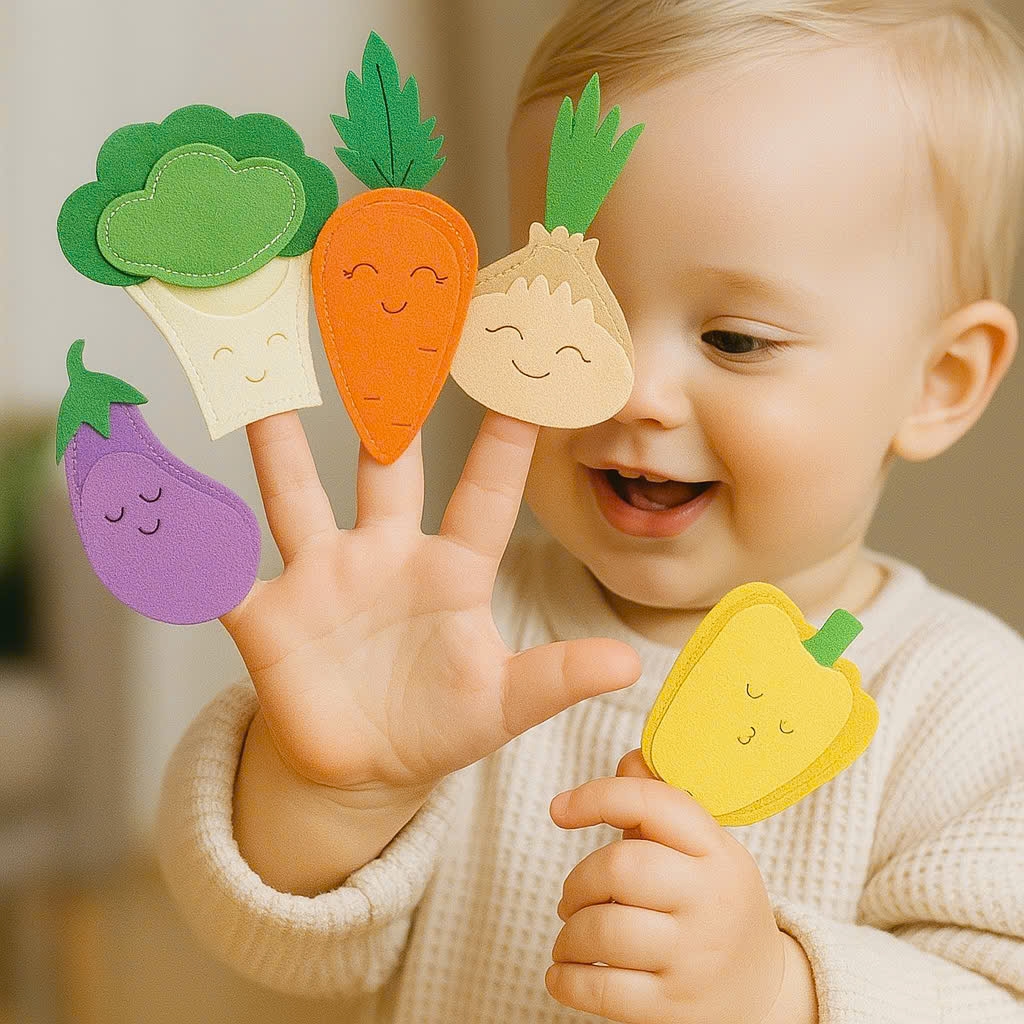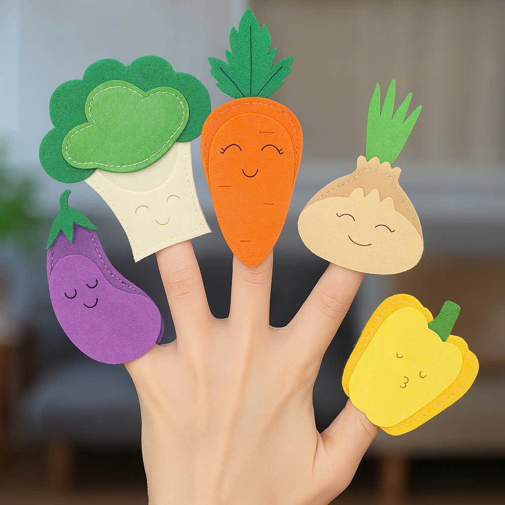Bộ 5 rối ngón tay hình rau củ dễ thương: cà rốt, bông cải, hành tây, cà tím, ớt chuông