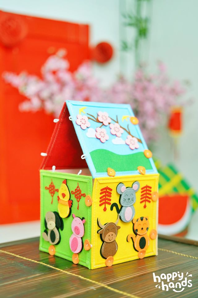 Từ hình hộp 6 mặt, bố mẹ chỉ cần tháo rời 2 mặt đáy đối diện nhau, giữ nguyên 4 mặt cạnh, sau đó ghép 2 mặt đáy lên trên thành hình mái nhà. Vậy là các bé đã có ngay một ngôi nhà thật là Tết, vô cùng sáng tạo. Tết là để trở về Nhà. Ngôi nhà ngày Tết ấm áp này sẽ tự nhiên đi vào tiềm thức của trẻ, như một hình ảnh gắn liền với ngày Tết cổ truyền ý nghĩa.