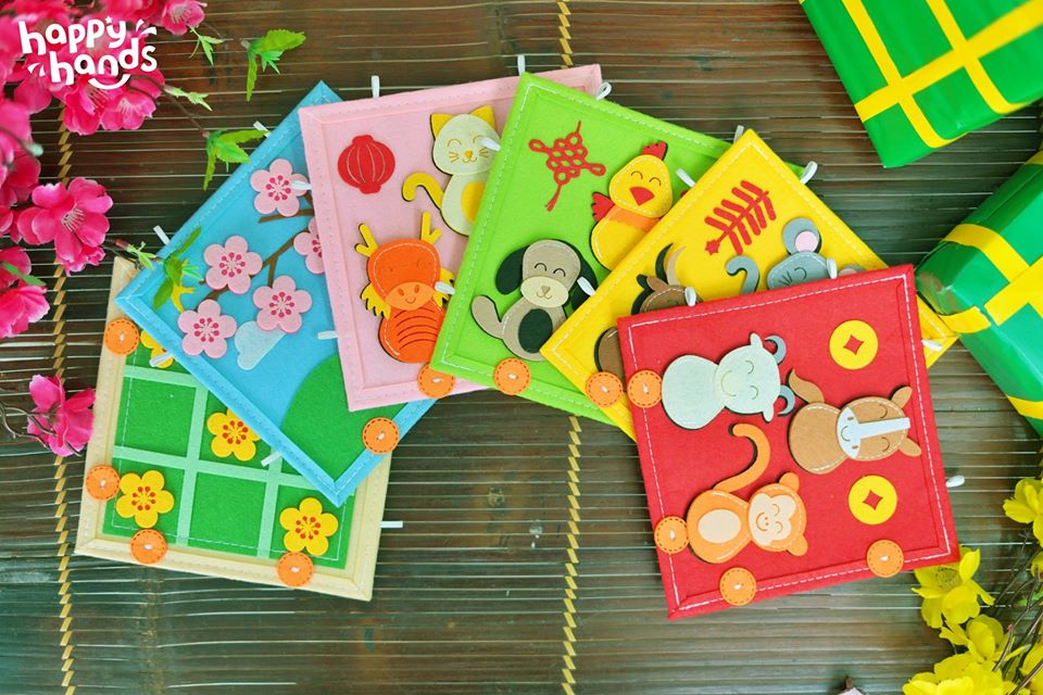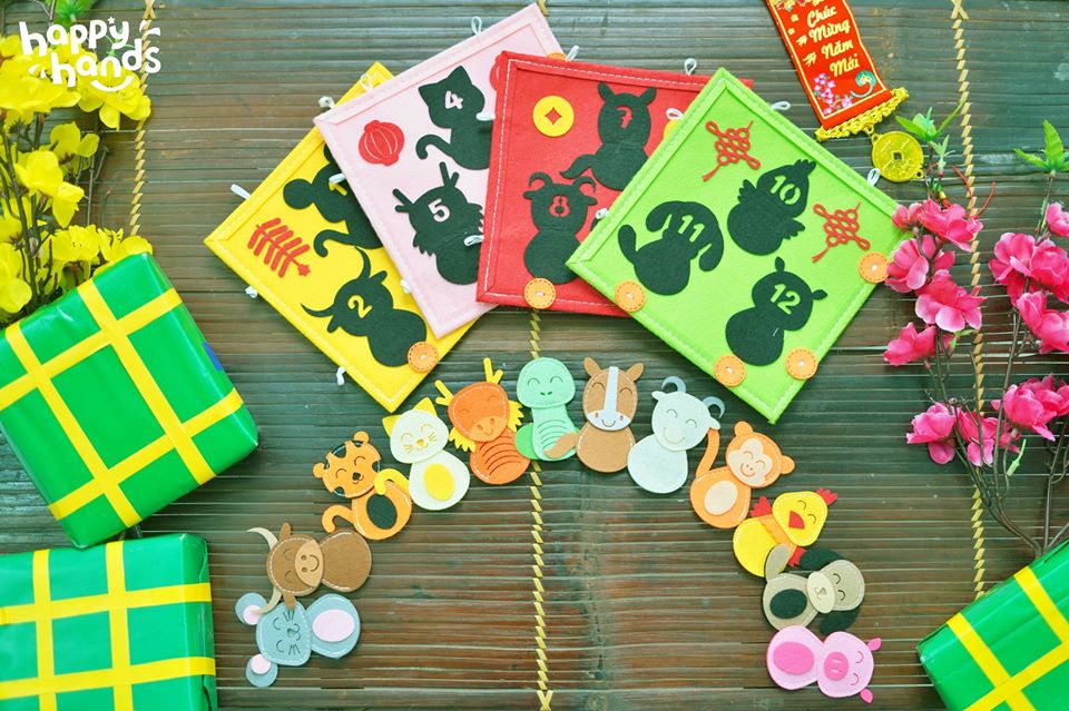 Để trang trí nhà ngày Tết, các trang sách vải dễ dàng kết nối để thành một bức tranh vừa trang trí mang không khí Tết về nhà, vừa là một chiếc bảng bận rộn (khái niệm cũng không còn quá xa lạ với các bố mẹ) khiến bé lúc nào cũng muốn chạy qua chạy lại, bận rộn tíu tít vừa chơi vừa học. Bố mẹ có thể ghép 4 trang 12 con giáp, thành một bảng bận rộn 2x2 chủ đề 12 con giáp, hoặc ghép cả 6 trang, thành bảng bận rộn 3x2. Bảng này có thể dễ dàng treo lên tường, chỉ cần một thanh ngang treo qua các dây chun phía trên để cố định tạo độ cứng và phẳng cho bảng, sau đó treo lên móc trên tường bằng dây.
